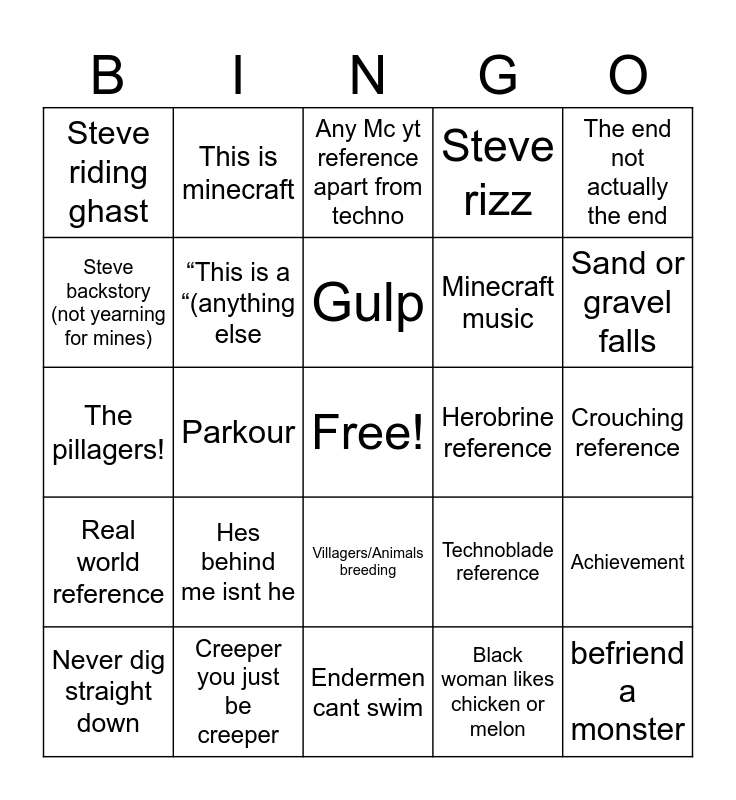 This bingo card has a free space and 24 words: Hes behind me isnt he, Creeper you just be creeper, Gulp, Never dig straight down, The end not actually the end, Steve riding ghast, Steve backstory (not yearning for mines), This is minecraft, Herobrine reference, Villagers/Animals breeding, Minecraft music, The pillagers!, Technoblade reference, Achievement, “This is a “(anything else, Black woman likes chicken or melon, Crouching reference, Any Mc yt reference apart from techno, Sand or gravel falls, Parkour, befriend a monster, Real world reference, Steve rizz and Endermen cant swim.