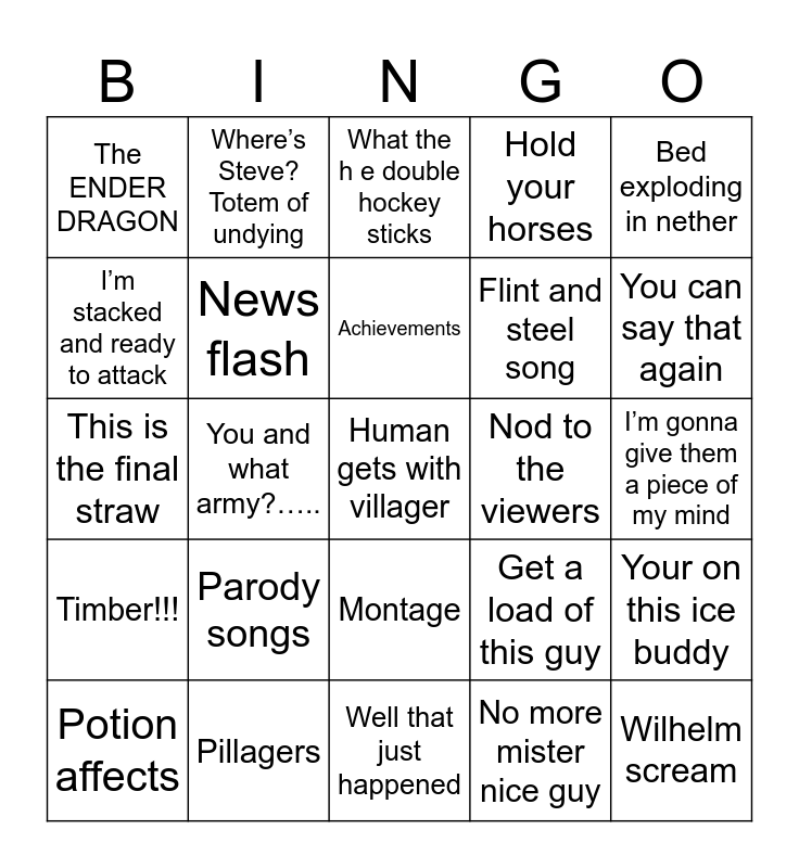 This bingo card has a free space and 24 words: Parody songs, Pillagers, Achievements, Potion affects, Bed exploding in nether, The ENDER DRAGON, I’m stacked and ready to attack, Where’s Steve? Totem of undying, Nod to the viewers, Montage, Flint and steel song, This is the final straw, Get a load of this guy, Your on this ice buddy, News flash, No more mister nice guy, I’m gonna give them a piece of my mind, What the h e double hockey sticks, You can say that again, You and what army?….., Wilhelm scream, Timber!!!, Hold your horses and Well that just happened.