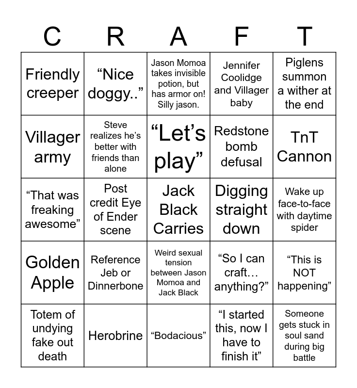 This bingo card has a free space and 24 words: Reference Jeb or Dinnerbone, Herobrine, “Let’s play”, Totem of undying fake out death, Piglens summon a wither at the end, Friendly creeper, Villager army, “Nice doggy..”, Digging straight down, Weird sexual tension between Jason Momoa and Jack Black, Redstone bomb defusal, “That was freaking awesome”, “So I can craft… anything?”, “This is NOT happening”, Steve realizes he’s better with friends than alone, “I started this, now I have to finish it”, Wake up face-to-face with daytime spider, Jason Momoa takes invisible potion, but has armor on! Silly jason., TnT Cannon, Post credit Eye of Ender scene, Someone gets stuck in soul sand during big battle, Golden Apple, Jennifer Coolidge and Villager baby and “Bodacious”.