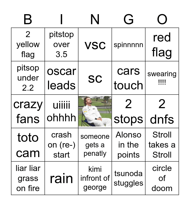 This bingo card has a free space and 24 words: crash on (re-) start, rain, sc, liar liar grass on fire, red flag, 2 yellow flag, pitsop under 2.2, pitstop over 3.5, 2 stops, someone gets a penatly, cars touch, crazy fans, Alonso in the points, Stroll takes a Stroll, oscar leads, tsunoda stuggles, 2 dnfs, vsc, swearing !!!!, uiiiii ohhhh, circle of doom, toto cam, spinnnnn and kimi infront of george.