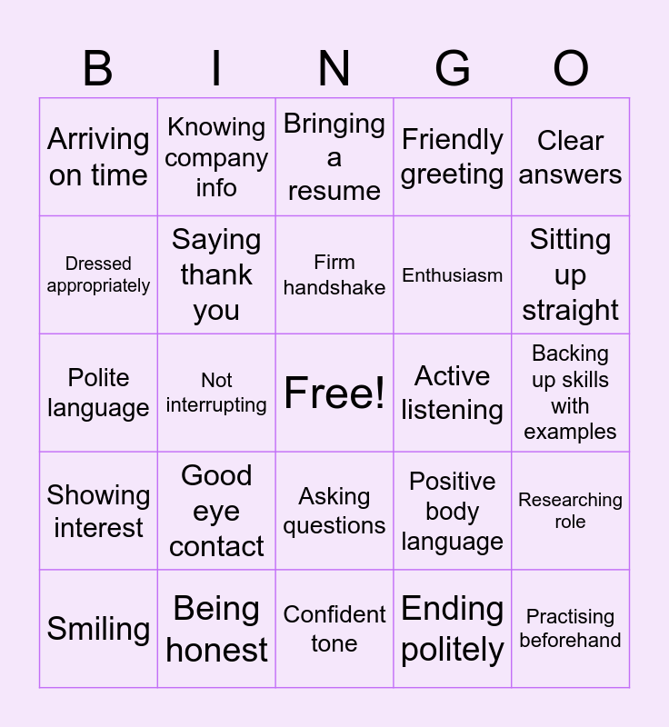 This bingo card has a free space and 25 words: Good eye contact, Confident tone, Firm handshake, Smiling, Clear answers, Arriving on time, Dressed appropriately, Knowing company info, Active listening, Asking questions, Enthusiasm, Polite language, Positive body language, Researching role, Saying thank you, Speaking clearly, Backing up skills with examples, Bringing a resume, Sitting up straight, Not interrupting, Practising beforehand, Being honest, Showing interest, Friendly greeting and Ending politely.