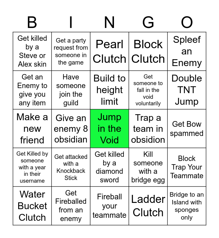 This bingo card has a free space and 24 words: Get attacked with a Knockback Stick, Get Fireballed from an enemy, Build to height limit, Water Bucket Clutch, Spleef an Enemy, Get killed by a Steve or Alex skin, Get an Enemy to give you any item, Get a party request from someone in the game, Trap a team in obsidion, Get killed by a diamond sword, Get someone to fall in the void voluntarily, Make a new friend, Kill someone with a bridge egg, Block Trap Your Teammate, Have someone join the guild, Ladder Clutch, Get Bow spammed, Pearl Clutch, Double TNT Jump, Give an enemy 8 obsidian, Bridge to an Island with sponges only, Get Killed by someone with a year in their username, Block Clutch and Fireball your teammate.