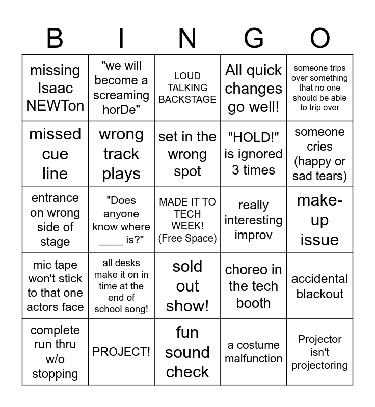 This bingo card has a free space and 24 words: complete run thru w/o stopping, all desks make it on in time at the end of school song!, set in the wrong spot, a costume malfunction, someone trips over something that no one should be able to trip over, missing Isaac NEWTon, "we will become a screaming horDe", LOUD TALKING BACKSTAGE, really interesting improv, make-up issue, entrance on wrong side of stage, wrong track plays, choreo in the tech booth, accidental blackout, missed cue line, PROJECT!, fun sound check, All quick changes go well!, someone cries (happy or sad tears), mic tape won't stick to that one actors face, "Does anyone know where ____ is?", sold out show!, "HOLD!" is ignored 3 times and Projector isn't projectoring.