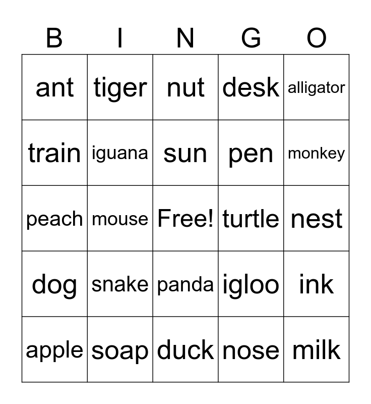 This bingo card has a free space and 24 words: snake, soap, sun, apple, alligator, ant, train, tiger, turtle, panda, pen, peach, igloo, ink, iguana, nose, nest, nut, monkey, mouse, milk, dog, desk and duck.
