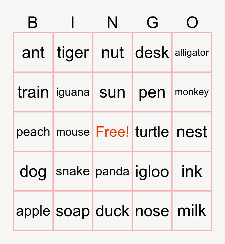 This bingo card has a free space and 24 words: snake, soap, sun, apple, alligator, ant, train, tiger, turtle, panda, pen, peach, igloo, ink, iguana, nose, nest, nut, monkey, mouse, milk, dog, desk and duck.