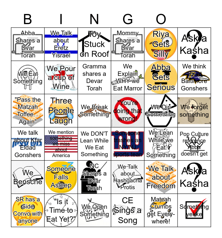 This bingo card has 74 images and 78 words: Kinderlach Spill, Kinderlach Spill # 2, Toy Stuck on Roof, Everyone Sings Together, Naftali Laughs, Mommy Rolls Eyes, Matzah Crumbs get Every-where!, Grown Ups Spill, CE Sings a Song, Kasha with No Answer, NC Shares a Dvar Torah, SR Shares a Dvar Torah, Mommy Shares a Dvar Torah, Abba Shares a Dvar Torah, YM Shares a Dvar Torah, Ask a Kasha, Ask a Kasha, We Dip Something, Ask a Kasha, We Break Something, We Open Something, Riya Gets Silly, Abba Gets Serious, We Pour a cup of Wine, We Eat Something, We Pour ANOTHER Cup Wine, We Say Thank you To Hashem, Someone Acts like a Slave, Someone Acts like a Slave Owner, We Explain WHY we Eat Matzah, We Explain WHY we Eat Marror, We Explain WHY we Tell the Story, We Lean While we Eat Something, We Bensche, We DON'T Lean While We Eat Something, Three People Laugh, Two People Laugh, Someone Goes to the Bathroom, "Is it Time to Eat Yet?", "Pass the Matzah Toffee... Again", Someone Falls Asleep, Someone "Utzes", YM Changes Seats, NC's Face Gets all Smiled Up, SR has a Side Convo with anyone, We Talk about Eretz Yisrael, We Talk about Hashgacha Protis, We Talk about Freedom, We Talk about Yam Suf, We Talk about Pajamas, We mention something we miss about America, We think about Baltimore Gonshers, We talk about Kfar Eldad Gonshers, Zaide sings "v'kariv pizurainu", Gramma snorts while laughing, Zaide says Nobbies of Egypt, Something yekke, non gebrokts, kid sits on Gramma's lap, We forget something, Gramma shares a Devar Torah, Zaide stretches a makah, CE uses an Israeli Accent, Someone Falls Asleep, Abba says, "good question" to hide he doesnt know an answer, We learn a Belgrade Minhag, We learn a Davidson Minhag, We Learn a Krombach Minhag, "You're doing that wrong!, Someone trashes an NY/NJ sports tean, "Chiefs Nation!", A Krombach Rolls Eyes, A Gonsher Rolls Eyes, Someone asks about a family tree, Pop Culture reference Abba doesn't get, This isn't how so-and-so makes it..., Someone plays Jewish Geography and "What Yeshiva / Seminary are you in again?.