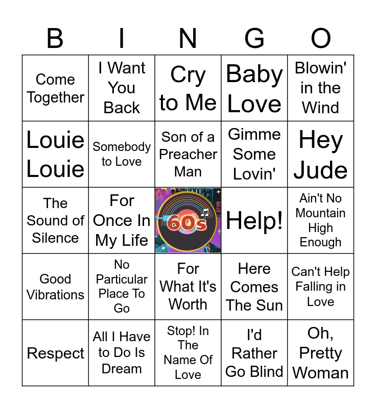 This bingo card has a free space and 69 words: A Whiter Shade of Pale, Ain't No Mountain High Enough, Ain't Too Proud To Beg, All Along the Watchtower, All I Have to Do Is Dream, Baby, I Love You, Baby Love, Be My Baby, Blowin' in the Wind, California Dreamin', Can't Help Falling in Love, Can't Take My Eyes off You, Come Together, Cry to Me, Dancing In The Street, For Once In My Life, For What It's Worth, Gimme Some Lovin', Good Lovin', Good Vibrations, Help!, Here Comes The Sun, Hey Jude, (I Can't Get No) Satisfaction, I Can't Stop Loving You, I Got You (I Feel Good), I Heard It Through The Grapevine, I Only Want To Be With You, I'd Rather Go Blind, I Want To Hold Your Hand, I Want You Back, I'm a Believer, I'm a Man, In the Midnight Hour, L-O-V-E, Let's Twist Again, Light My Fire, Like a Rolling Stone, Louie Louie, My Girl, No Particular Place To Go, Oh, Pretty Woman, One Fine Day, One Love, Proud Mary, Respect, Ring of Fire, Runaround Sue, Sloop John B, Somebody to Love, Son of a Preacher Man, Soul Man, Stand By Me, Stop! In The Name Of Love, Strangers In The Night, Suspicious Minds, Sweet Caroline, The Letter, The Shoop Shoop Song (It's In His Kiss), The Sound of Silence, The Times They Are A-Changin', The Twist, These Boots Are Made for Walkin', Walk Like a Man, Wild Thing, Yesterday, You Can't Hurry Love, You Really Got Me and (Your Love Keeps Lifting Me) Higher & Higher.