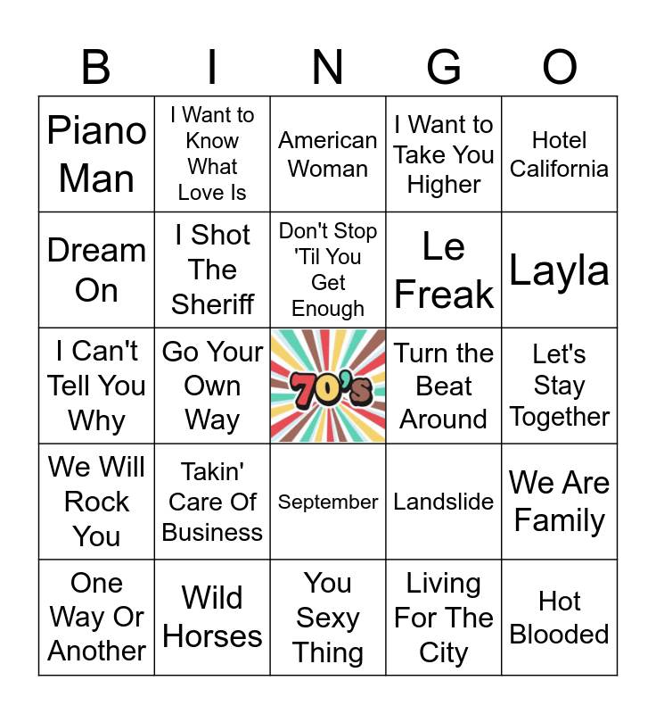This bingo card has a free space and 75 words: Ain't No Sunshine, American Pie, American Woman, Baba O'Riley, Bad Girls, Best of My Love, Black Dog, Bohemian Rhapsody, Born to Run, Dancing In The Street, Dancing Queen, Don't Stop, Don't Stop 'Til You Get Enough, Dream On, Free Bird, Go Your Own Way, Heart Of Glass, Hot Blooded, Hot Stuff, Hotel California, How Deep Is Your Love, I Can't Tell You Why, I Shot The Sheriff, I Want to Know What Love Is, I Want to Take You Higher, I Will Survive, I'll Be There, I'm Your Boogie Man, If You Leave Me Now, Imagine, Is This Love, Jungle Boogie, Kung Fu Fighting, Landslide, Layla, Le Freak, Let's Get It On, Let's Groove, Let's Stay Together, Living For The City, Love Train, Macho Man, Midnight Train to Georgia, More Than A Woman, My Sharona, No Woman, No Cry, One Way Or Another, Piano Man, Rebel Rebel, Rock Lobster, Roxanne, September, Shining Star, Something In The Air, Stay, Stayin Alive, Sultans of Swing, Superstition, Sweet Home Alabama, Take It Easy, Takin' Care Of Business, The Chain, The Hustle, The Joker, The Night the Lights Went out in Georgia, Turn the Beat Around, Tush, Two Out of Three Ain't Bad, Walk On the Wild Side, We Are Family, We Will Rock You, Wild Horses, You Make Me Feel Like Dancing, You Sexy Thing and You're My Best Friend.
