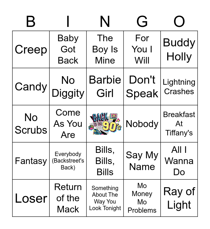 This bingo card has a free space and 64 words: 1979, ...Baby One More Time, 3AM, All I Wanna Do, All Star, All That She Wants, Baby Got Back, Back That Thang Up, Barbie Girl, Believe, Bills, Bills, Bills, Blue (Da Ba Dee), Breakfast At Tiffany's, Buddy Holly, Can You Feel the Love Tonight, Candy, Come As You Are, Creep, Cryin', Don't Speak, Everybody (Backstreet's Back), Fantasy, For You I Will, Gettin' Jiggy Wit It, Gonna Make You Sweat, Hold On, I Need to Know, I Swear, I Want It That Way, I'll Be Missing You, Ice Ice Baby, Iris, Jump, Killing Me Softly With His Song, Lightning Crashes, Loser, Macarena, Mo Money Mo Problems, My Lovin' (You're Never Gonna Get It), No Diggity, No Scrubs, Nobody, One Of Us, Peaches, Praise You, Ray of Light, Return of the Mack, Run-Around, Say My Name, Semi-Charmed Life, Shine, Smells Like Teen Spirit, Something About The Way You Look Tonight, Stay (I Missed You), Strong Enough, Take a Bow, The Boy Is Mine, The Sign, Tubthumping, Un-Break My Heart, Wannabe, When I Come Around, Wonderwall and You Were Meant For Me.