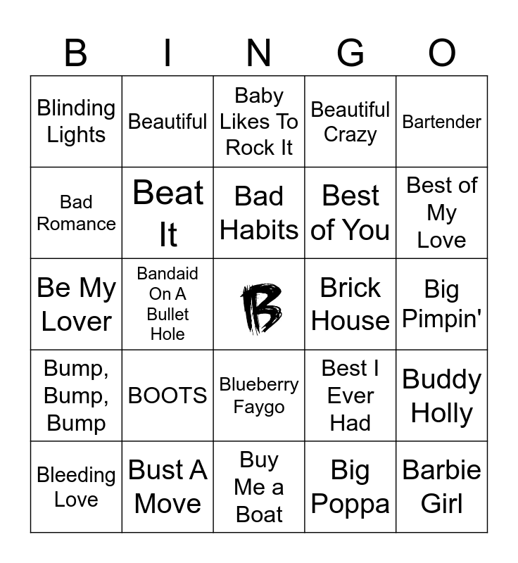 This bingo card has a free space and 77 words: Baby Blue, Baby Got Back, Baby Likes To Rock It, Baby Love, Baby Shark, Baby, I Love You, Back In Black, Back That Thang Up, Back When, Bad At Love, Bad Day, Bad Girls, Bad Habits, Bad Romance, Bad To The Bone, Bandaid On A Bullet Hole, Bang Bang, Barbie Girl, Barefoot And Crazy, Bartender, Be My Baby Tonight, Be My Lover, Beat It, Beautiful, Beautiful Crazy, Beautiful Day, Beautiful Girls, Because You Loved Me, Beer For My Horses, Before He Cheats, Believe, Believer, Bennie And The Jets, Best I Ever Had, Best of My Love, Best of You, Big Girls Don't Cry, Big Green Tractor, Big Pimpin', Big Poppa, Bills, Bills, Bills, Black, Black Hole Sun, Black Magic Woman, Blame It, Blame It on the Rain, Bleeding Love, Blinding Lights, Blue (Da Ba Dee), Blue Ain't Your Color, Blue Suede Shoes, Blueberry Faygo, Blueberry Hill, Bluebird, Blurred Lines, Bohemian Rhapsody, Boogie Oogie Oogie, Boogie Shoes, Boombastic, Boot Scootin' Boogie, BOOTS, Born Free, Born This Way, Boulevard of Broken Dreams, Brand New Man, Brass Monkey, Breathe Again, Brick House, Bring Em Out, Broadway Girls, Bubba Shot The Jukebox, Buddy Holly, Bump, Bump, Bump, Bust A Move, Buy Dirt, Buy Me a Boat and Bye Bye Love.