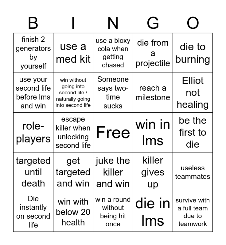 This bingo card has a free space and 24 words: Die instantly on second life, get targeted and win, Someone says two-time sucks, die in lms, die to burning, finish 2 generators by yourself, use a med kit, use a bloxy cola when getting chased, win in lms, be the first to die, role-players, win without going into second life / naturally going into second life, killer gives up, useless teammates, use your second life before lms and win, win with below 20 health, win a round without being hit once, die from a projectile, Elliot not healing, targeted until death, escape killer when unlocking second life, juke the killer and win, reach a milestone and survive with a full team due to teamwork.