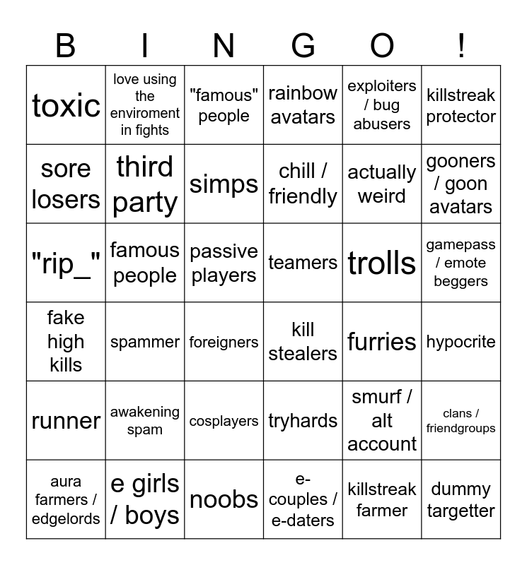 This bingo card has 36 words: tryhards, cosplayers, e-couples / e-daters, sore losers, fake high kills, teamers, third party, noobs, exploiters / bug abusers, smurf / alt account, gooners / goon avatars, rainbow avatars, clans / friendgroups, famous people, chill / friendly, toxic, runner, trolls, "rip_", "famous" people, passive players, spammer, kill stealers, foreigners, furries, love using the enviroment in fights, actually weird, e girls / boys, simps, killstreak protector, dummy targetter, aura farmers / edgelords, hypocrite, gamepass / emote beggers, awakening spam and killstreak farmer.