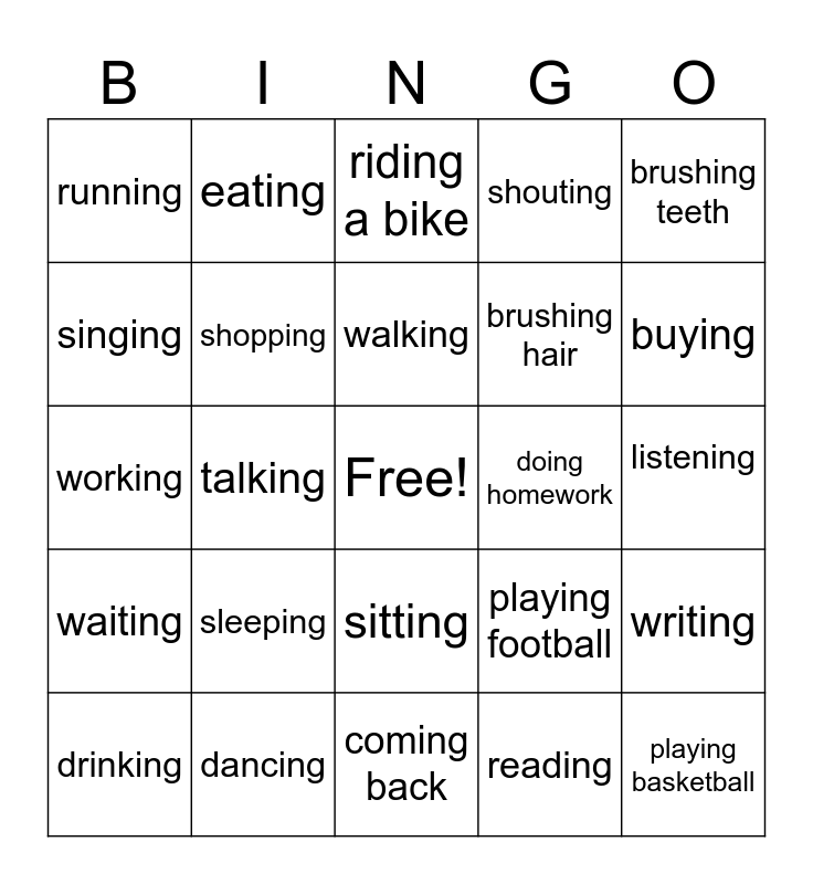 This bingo card has a free space and 24 words: sleeping, dancing, walking, drinking, brushing teeth, running, singing, eating, doing homework, sitting, brushing hair, working, playing football, writing, shopping, reading, listening, riding a bike, buying, talking, playing basketball, waiting, shouting and coming back.
