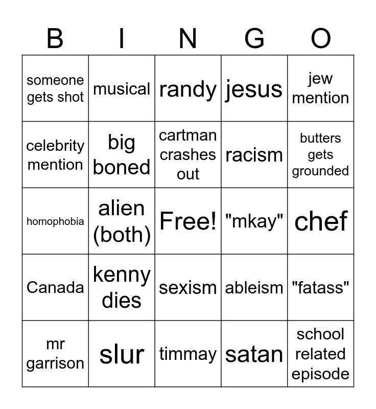 This bingo card has a free space and 24 words: kenny dies, slur, cartman crashes out, mr garrison, jew mention, someone gets shot, celebrity mention, musical, "mkay", sexism, racism, homophobia, ableism, "fatass", big boned, satan, chef, randy, butters gets grounded, alien (both), school related episode, Canada, jesus and timmay.