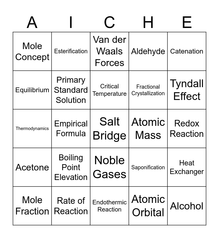 This bingo card has 25 words: Acetone, Rate of Reaction, Salt Bridge, Atomic Orbital, Catenation, Mole Concept, Esterification, Van der Waals Forces, Atomic Mass, Heat Exchanger, Equilibrium, Primary Standard Solution, Endothermic Reaction, Saponification, Tyndall Effect, Mole Fraction, Empirical Formula, Critical Temperature, Fractional Crystallization, Redox Reaction, Thermodynamics, Boiling Point Elevation, Noble Gases, Aldehyde and Alcohol.