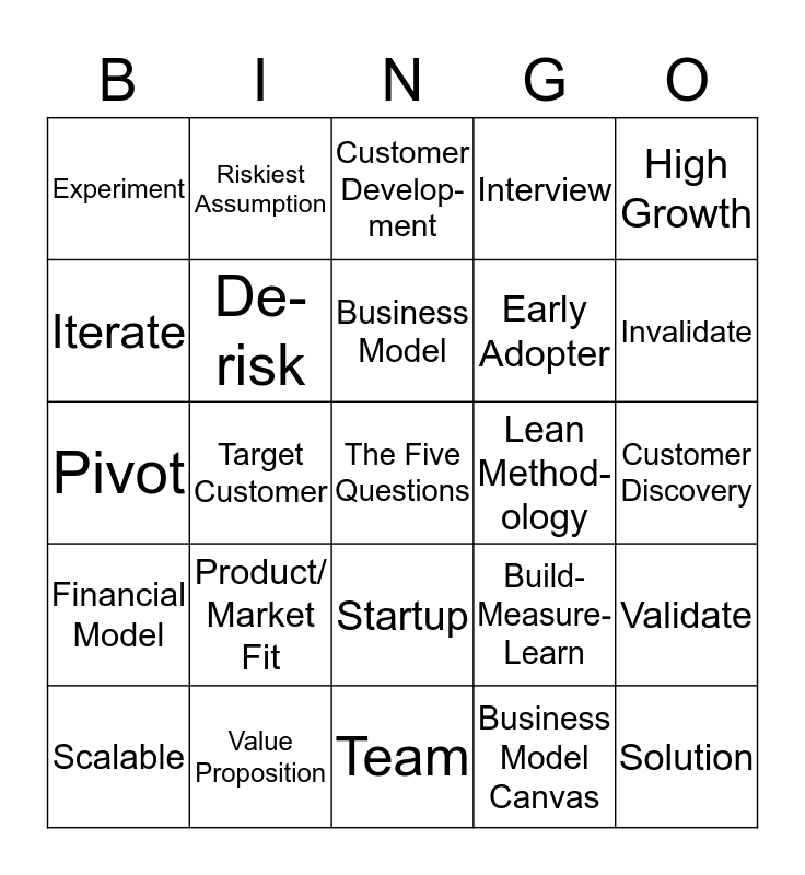 This bingo card has a free space and 24 words: Product/ Market Fit, Value Proposition, Business Model, Scalable, High Growth, Experiment, Iterate, Riskiest Assumption, Lean Method-ology, Startup, Early Adopter, Pivot, Build-Measure-Learn, Validate, De-risk, Business Model Canvas, Customer Discovery, Customer Develop-ment, Invalidate, Target Customer, Solution, Financial Model, Interview and Team.