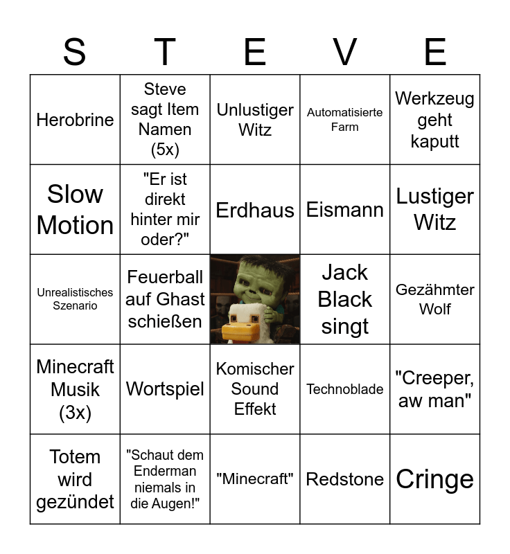 This bingo card has a free space and 24 words: Totem wird gezündet, Wortspiel, Erdhaus, Redstone, Werkzeug geht kaputt, Herobrine, Steve sagt Item Namen (5x), Unlustiger Witz, Jack Black singt, Gezähmter Wolf, Unrealistisches Szenario, "Er ist direkt hinter mir oder?", Technoblade, "Creeper, aw man", Slow Motion, "Schaut dem Enderman niemals in die Augen!", "Minecraft", Automatisierte Farm, Lustiger Witz, Minecraft Musik (3x), Feuerball auf Ghast schießen, Komischer Sound Effekt, Eismann and Cringe.