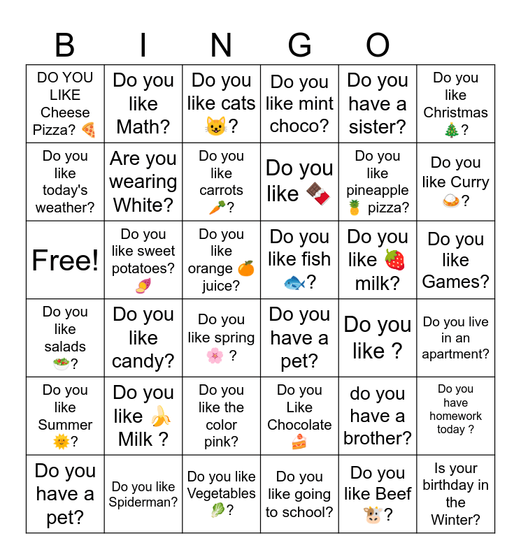 This bingo card has 36 words: Do you Like Chocolate ๐ฐ, Do you like the color pink?, Do you like going to school?, Do you like today's weather?, Do you like salads ๐ฅ?, Do you like fish ๐?, Are you wearing White?, Do you like Vegetables ๐ฅฌ?, Do you have a sister?, do you have a brother?, Do you like Curry ๐?, Do you like mint choco?, Do you have homework today ?, Do you like sweet potatoes?๐ , Do you like ๐ซ, DO YOU LIKE Cheese Pizza? ๐, Do you like Summer ๐?, Do you like ๐ milk?, Free!, Do you like cats๐บ?, Do you like orange ๐ juice?, Do you like candy?, Do you have a pet?, Do you like spring ๐ธ ?, Do you like ?, Do you like Math?, Do you like pineapple ๐ pizza?, Do you like Spiderman?, Do you like carrots ๐ฅ?, Do you like Christmas ๐?, Is your birthday in the Winter?, Do you have a pet?, Do you live in an apartment?, Do you like Games?, Do you like ๐Milk ? and Do you like Beef ๐ฎ?.