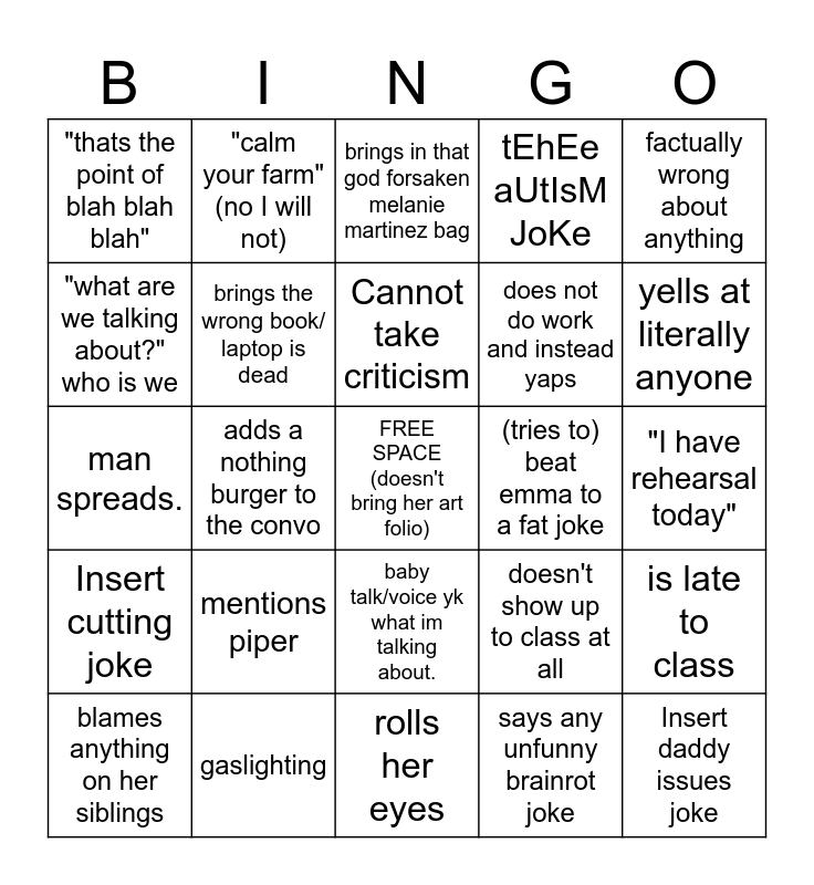 This bingo card has a free space and 24 words: mentions piper, gaslighting, Cannot take criticism, blames anything on her siblings, factually wrong about anything, "thats the point of blah blah blah", "what are we talking about?" who is we, "calm your farm" (no I will not), (tries to) beat emma to a fat joke, baby talk/voice yk what im talking about., does not do work and instead yaps, man spreads., doesn't show up to class at all, is late to class, brings the wrong book/ laptop is dead, says any unfunny brainrot joke, "I have rehearsal today", brings in that god forsaken melanie martinez bag, yells at literally anyone, adds a nothing burger to the convo, Insert daddy issues joke, Insert cutting joke, tEhEe aUtIsM JoKe and rolls her eyes.