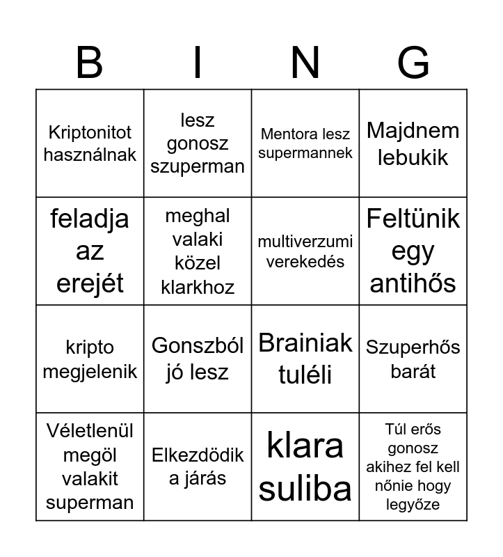 This bingo card has 16 words: Elkezdödik a járás, Szuperhős barát, Mentora lesz supermannek, Kriptonitot használnak, kripto megjelenik, lesz gonosz szuperman, Brainiak tuléli, klara suliba, feladja az erejét, meghal valaki közel klarkhoz, Véletlenül megöl valakit superman, Majdnem lebukik, Gonszból jó lesz, Feltünik egy antihős, multiverzumi verekedés and Túl erős gonosz akihez fel kell nőnie hogy legyőze.