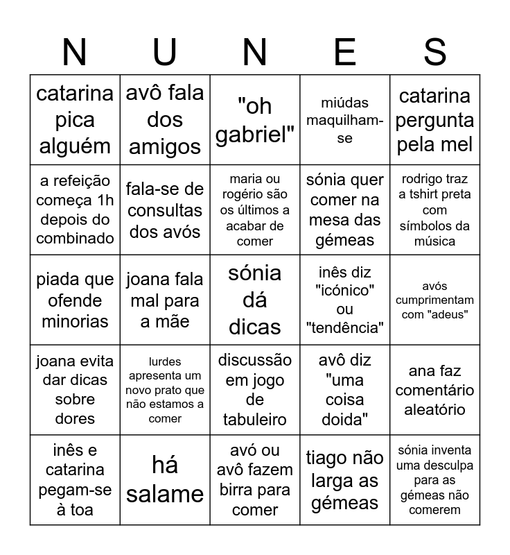 This bingo card has 52 words: avô não aparece, sónia dá dicas, inês fala da kika, avó ou avô fazem birra para comer, lurdes apresenta um novo prato que não estamos a comer, rogério chama cromo a alguém, avô fala dos amigos, avô conta 3 histórias, a refeição começa 1h depois do combinado, fala-se da perna da inês, fala-se de consultas dos avós, sérgio bebe e fica com a cara vermelha, ana faz comentário aleatório, avô diz "uma coisa doida", alguém diz "copo de vinho", maria ou gémeas dizem algo em brasileiro, maria ou rogério são os últimos a acabar de comer, inês diz "icónico" ou "tendência", avô conta história com figura de autoridade, catarina pergunta pela mel, joana fala mal para a mãe, tiago não larga as gémeas, catarina pica alguém, sónia quer comer na mesa das gémeas, inês diz "mawuca", sónia inventa uma desculpa para as gémeas não comerem, inês ou gabriel falam de doenças, catarina ou joana intrometem-se na discussão, rodrigo traz a tshirt preta com símbolos da música, família branco é a última a chegar, rodrigo e/ou ricardo fazem batota, miúdas maquilham-se, tiago responde com duas frases, afonso traz legumes, alguém menciona o cabelo do avó, "oh gabriel", há salame, discussão acesa sobre política, joana e tomás falam sobre cubinho, leonor não quer cumprimentar, maria grita "mel" quando chega, avós cumprimentam com "adeus", joana evita dar dicas sobre dores, "oh lena", discussão em jogo de tabuleiro, sofia não quer comer, andré fala do técnico, piada que ofende minorias, gabriel goza com tema genérico, ricardo suja-se a comer, inês e catarina pegam-se à toa and lena ouve conversa alheia.