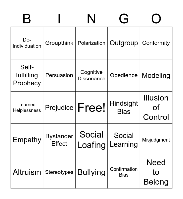 This bingo card has a free space and 24 words: Altruism, Bystander Effect, Cognitive Dissonance, Confirmation Bias, Conformity, De-Individuation, Groupthink, Polarization, Hindsight Bias, Illusion of Control, Learned Helplessness, Persuasion, Social Learning, Misjudgment, Self-fulfilling Prophecy, Stereotypes, Bullying, Outgroup, Modeling, Empathy, Prejudice, Social Loafing, Obedience and Need to Belong.
