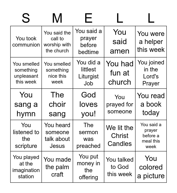 This bingo card has a free space and 25 words: You heard someone talk about Jesus, You put money in the offering, You did a littlest Liturgist Job, You played at the imagination station, You were a helper this week, You took communion, You smelled something unpleasant this week, You said the call to worship with the church, You prayed for someone, The sermon was preached, You had fun at church, You sang a hymn, We lit the Christ Candles, You said a prayer before a meal this week, You smelled something nice this week, You played in the rice bin, You read a book today, You said a prayer before bedtime, You joined in the Lord's Prayer, The choir sang, You colored a picture, You made the palm craft, You listened to the scripture, You said amen and You talked to God this week.