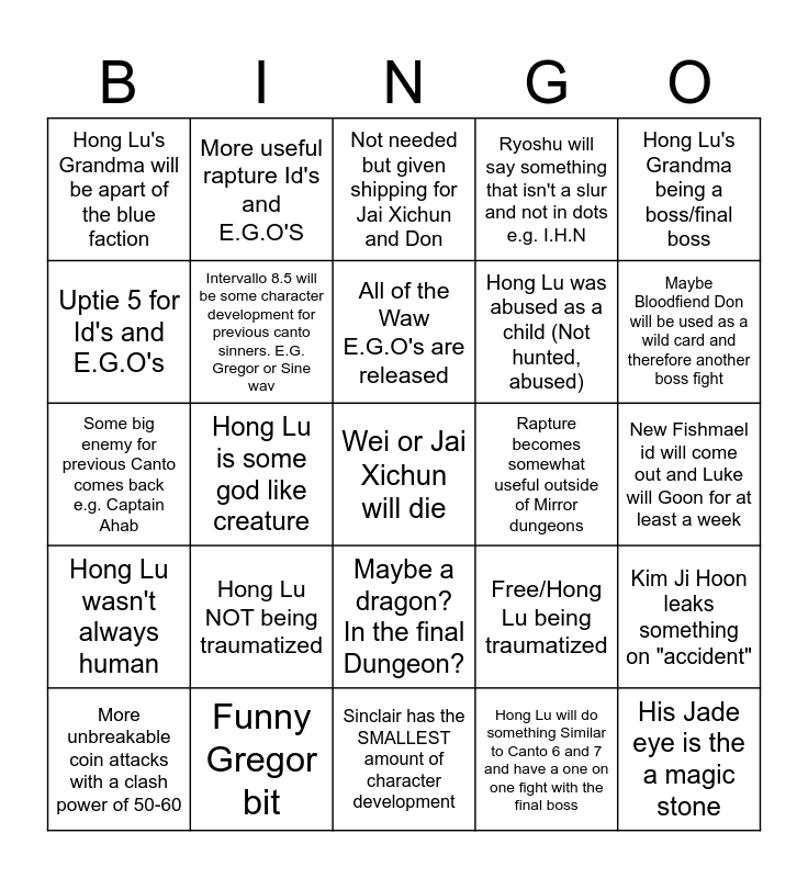 This bingo card has 25 words: Hong Lu NOT being traumatized, Sinclair has the SMALLEST amount of character development, All of the Waw E.G.O's are released, More unbreakable coin attacks with a clash power of 50-60, Hong Lu's Grandma being a boss/final boss, Hong Lu's Grandma will be apart of the blue faction, Uptie 5 for Id's and E.G.O's, More useful rapture Id's and E.G.O'S, Rapture becomes somewhat useful outside of Mirror dungeons, Maybe a dragon? In the final Dungeon?, Hong Lu was abused as a child (Not hunted, abused), Some big enemy for previous Canto comes back e.g. Captain Ahab, Free/Hong Lu being traumatized, Kim Ji Hoon leaks something on "accident", Intervallo 8.5 will be some character development for previous canto sinners. E.G. Gregor or Sine wav, His Jade eye is the a magic stone, New Fishmael id will come out and Luke will Goon for at least a week, Not needed but given shipping for Jai Xichun and Don, Maybe Bloodfiend Don will be used as a wild card and therefore another boss fight, Hong Lu is some god like creature, Wei or Jai Xichun will die, Funny Gregor bit, Hong Lu wasn't always human, Ryoshu will say something that isn't a slur and not in dots e.g. I.H.N and Hong Lu will do something Similar to Canto 6 and 7 and have a one on one fight with the final boss.