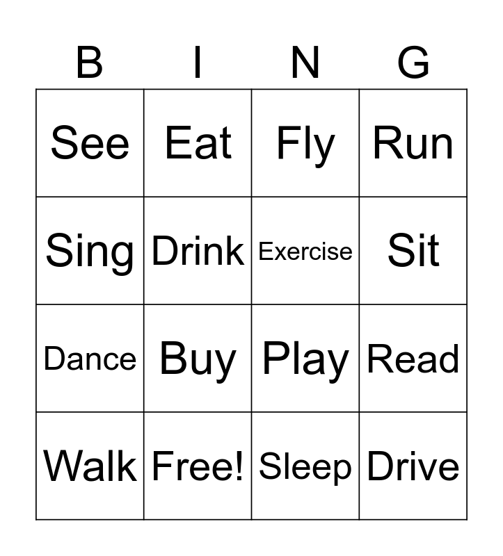 This bingo card has 16 words: Free!, Read, Fly, See, Dance, Eat, Play, Sleep, Sing, Drink, Walk, Run, Buy, Sit, Exercise and Drive.