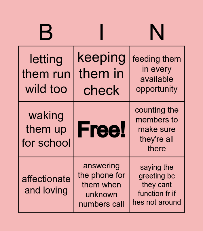 This bingo card has a free space and 8 words: counting the members to make sure they're all there, feeding them in every available opportunity, keeping them in check, affectionate and loving, letting them run wild too, saying the greeting bc they cant function fr if hes not around, waking them up for school and answering the phone for them when unknown numbers call.