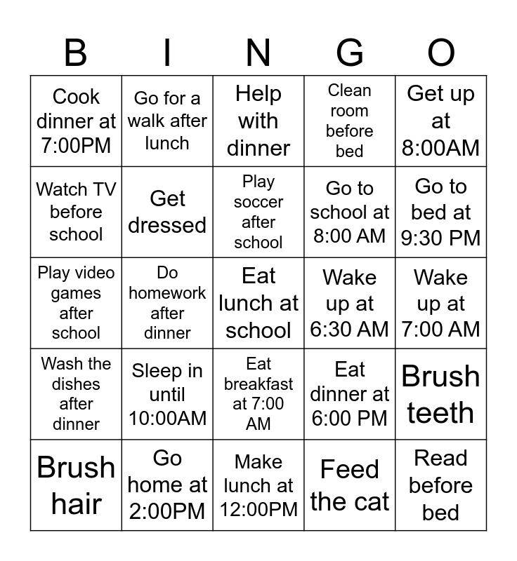This bingo card has 25 words: Sleep in until 10:00AM, Make lunch at 12:00PM, Play soccer after school, Brush hair, Get up at 8:00AM, Cook dinner at 7:00PM, Watch TV before school, Go for a walk after lunch, Wake up at 6:30 AM, Eat breakfast at 7:00 AM, Go to school at 8:00 AM, Play video games after school, Eat dinner at 6:00 PM, Brush teeth, Get dressed, Read before bed, Wake up at 7:00 AM, Help with dinner, Go to bed at 9:30 PM, Do homework after dinner, Eat lunch at school, Go home at 2:00PM, Wash the dishes after dinner, Clean room before bed and Feed the cat.
