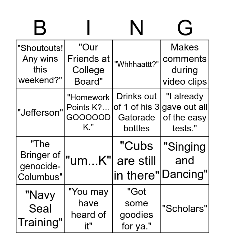 This bingo card has a free space and 15 words: "Navy Seal Training", "Scholars", "Whhhaattt?", "Shoutouts! Any wins this weekend?", "I already gave out all of the easy tests.", "Jefferson", "um...K", "Got some goodies for ya.", "Homework Points K?…GOOOOOD K.", "The Bringer of genocide-Columbus", "Singing and Dancing", Makes comments during video clips, Drinks out of 1 of his 3 Gatorade bottles, "Our Friends at College Board" and "You may have heard of it".