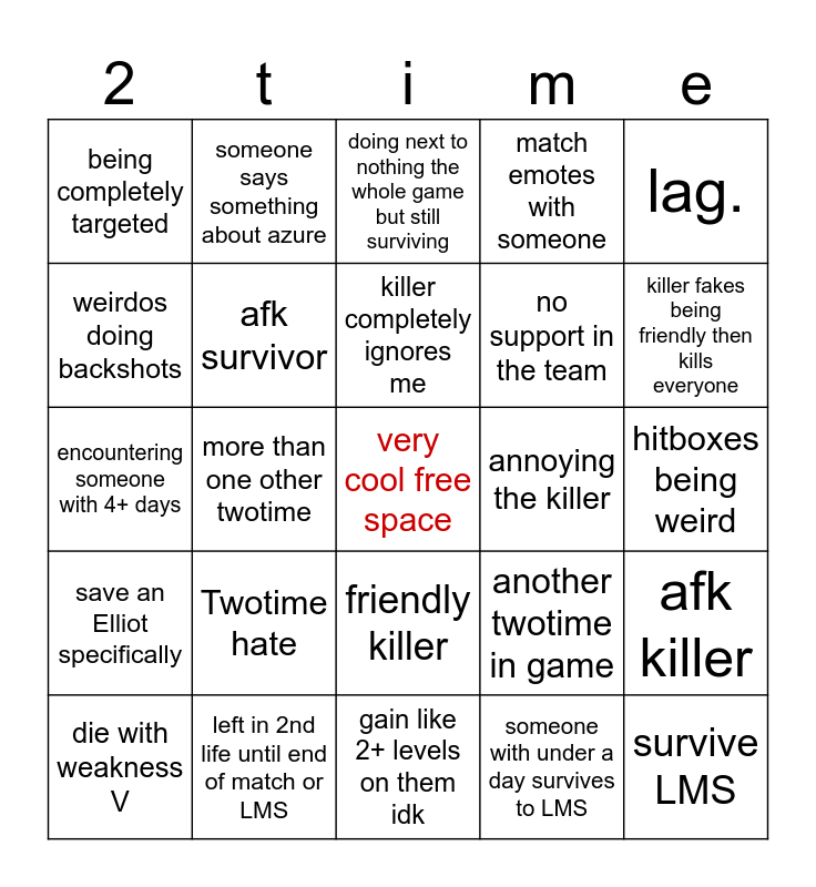 This bingo card has a free space and 24 words: Twotime hate, left in 2nd life until end of match or LMS, killer completely ignores me, die with weakness V, lag., being completely targeted, weirdos doing backshots, someone says something about azure, annoying the killer, friendly killer, no support in the team, encountering someone with 4+ days, another twotime in game, afk killer, afk survivor, someone with under a day survives to LMS, hitboxes being weird, doing next to nothing the whole game but still surviving, killer fakes being friendly then kills everyone, more than one other twotime, survive LMS, save an Elliot specifically, match emotes with someone and gain like 2+ levels on them idk.