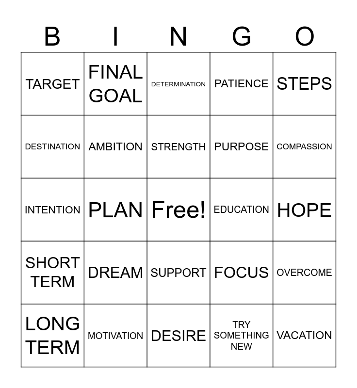 This bingo card has a free space and 24 words: DREAM, MOTIVATION, STRENGTH, LONG TERM, STEPS, TARGET, DESTINATION, FINAL GOAL, EDUCATION, SUPPORT, PURPOSE, INTENTION, FOCUS, OVERCOME, AMBITION, TRY SOMETHING NEW, HOPE, DETERMINATION, COMPASSION, PLAN, VACATION, SHORT TERM, PATIENCE and DESIRE.