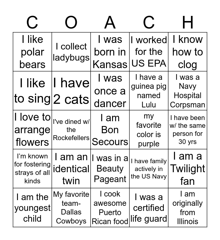 This bingo card has a free space and 24 words: I am an identical twin, My favorite team-Dallas Cowboys, I was once a dancer, I am the youngest child, I know how to clog, I like polar bears, I like to sing, I collect ladybugs, my favorite color is purple, I was in a Beauty Pageant, I have a guinea pig named Lulu, I love to arrange flowers, I have family actively in the US Navy, I am a Twilight fan, I have 2 cats, I was a certified life guard, I have been w/ the same person for 30 yrs, I was born in Kansas, I was a Navy Hospital Corpsman, I've dined w/ the Rockefellers, I am originally from Illinois, I’m known for fostering strays of all kinds, I worked for the US EPA and I cook awesome Puerto Rican food.