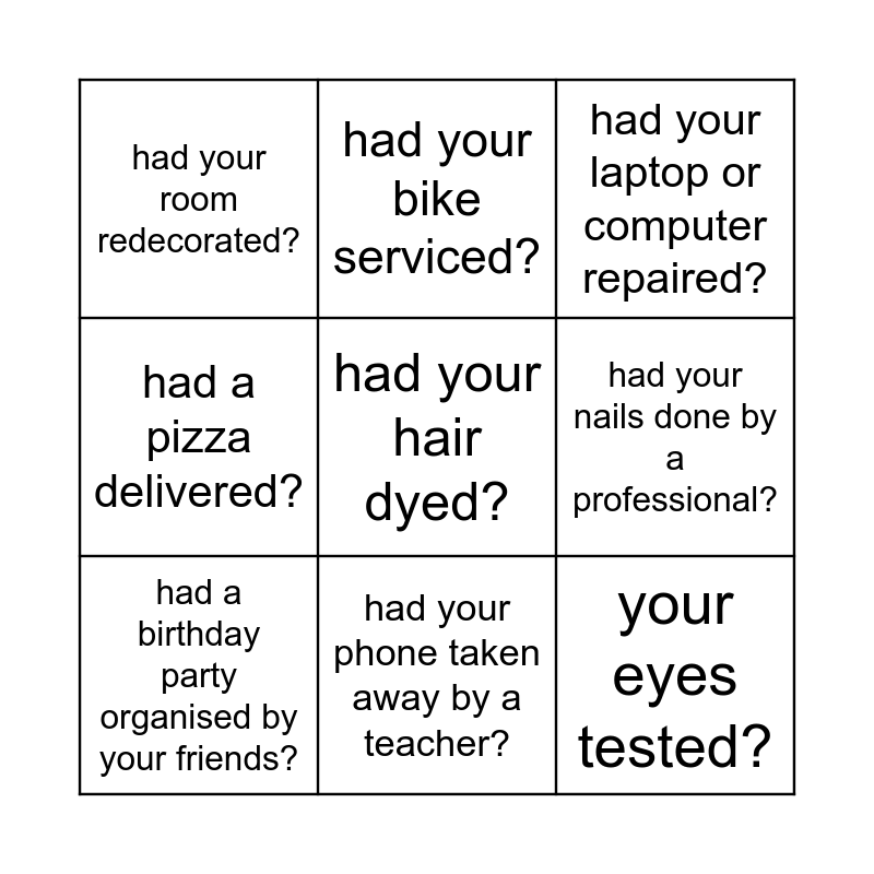This bingo card has 17 words: had your clothes made by a professional?, had your homework done by Chat GPT?, had your laptop or computer repaired?, had your room redecorated?, had your bones X-rayed?, had a pizza delivered?, had your photograph taken by a professional?, had a birthday party organised by your friends?, had your phone taken away by a teacher?, had your nails done by a professional?, had your ears pierced?, had your hair cut by a family member?, had your hair dyed?, had your bike serviced?, your eyes tested?, your wallet stolen? and your email box hacked?.