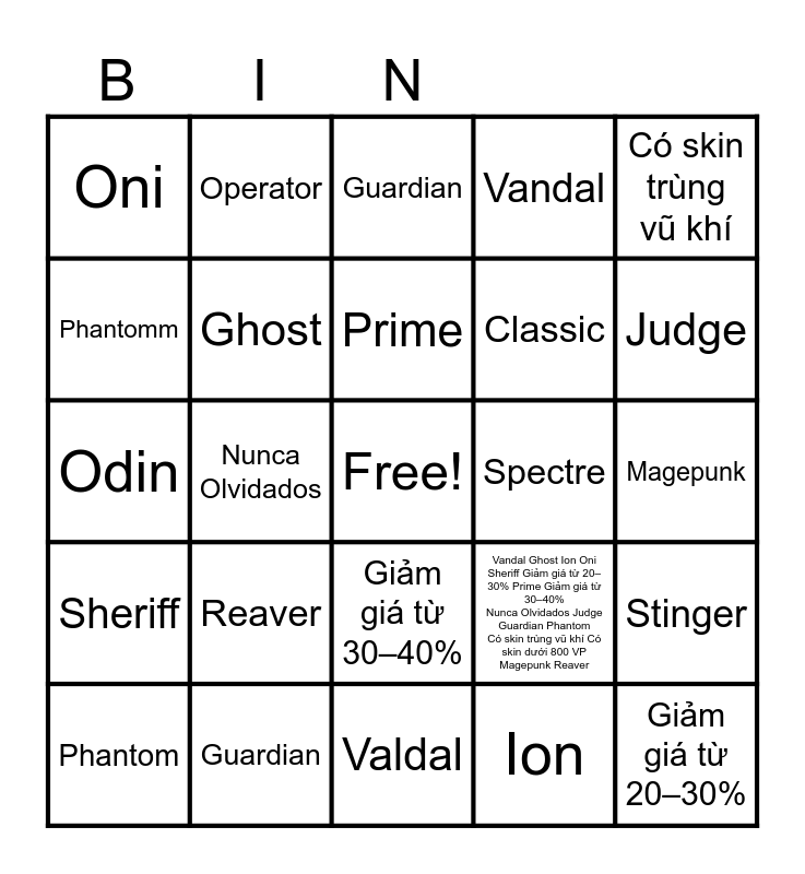 This bingo card has a free space and 27 words: Vandal Ghost Ion Oni Sheriff Giảm giá từ 20–30% Prime Giảm giá từ 30–40% Nunca Olvidados Judge Guardian Phantom Có skin trùng vũ khí Có skin dưới 800 VP Magepunk Reaver, Ghost, Classic, Valdal, Phantomm, Guardian, Operator, Sheriff, Spectre, Stinger, Odin, Vandal, Phantom, Guardian, Judge, Sheriff, Ghost, Prime, Reaver, Oni, Magepunk, Ion, Nunca Olvidados, Giảm giá từ 20–30%, Giảm giá từ 30–40%, Có skin trùng vũ khí and Có skin dưới 800 VP.