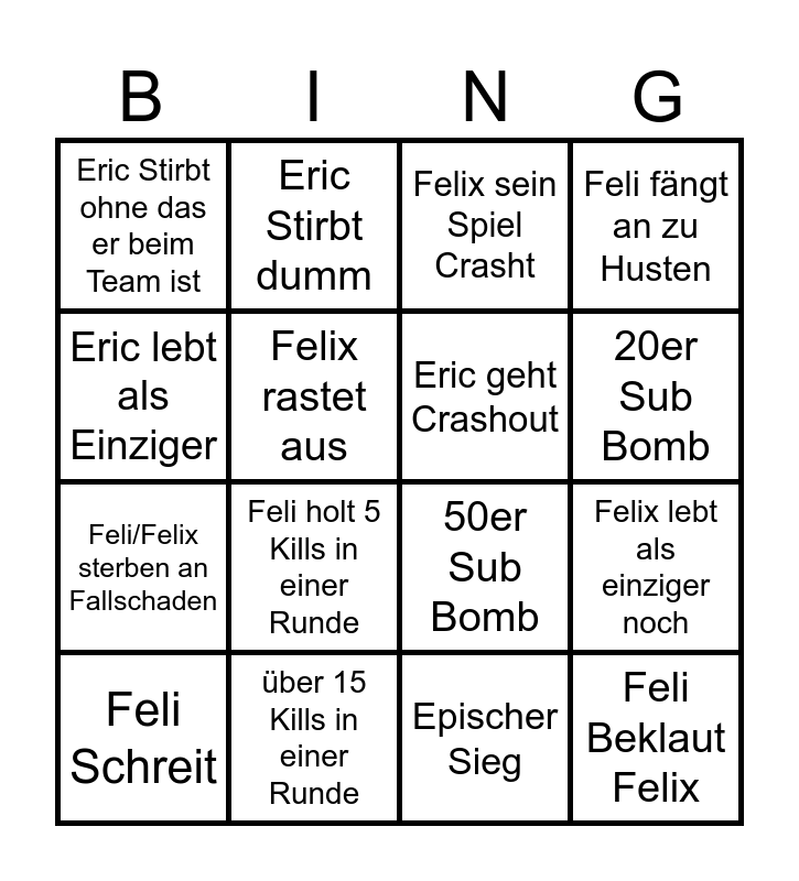 This bingo card has 16 words: Feli Schreit, über 15 Kills in einer Runde, Felix sein Spiel Crasht, Feli fängt an zu Husten, Eric lebt als Einziger, Eric Stirbt dumm, 50er Sub Bomb, Felix lebt als einziger noch, Eric Stirbt ohne das er beim Team ist, Felix rastet aus, Epischer Sieg, 20er Sub Bomb, Feli/Felix sterben an Fallschaden, Feli holt 5 Kills in einer Runde, Eric geht Crashout and Feli Beklaut Felix.