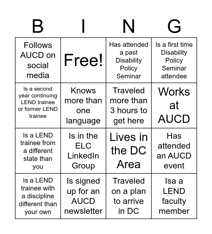 This bingo card has 19 words: Lives in the DC Area, Is a member of an AUCD SIG or Council, Has attended a past Disability Policy Seminar, Isa a LEND faculty member, Has attended an AUCD event, Is a second year continuing LEND trainee or former LEND trainee, Traveled on a plan to arrive in DC, Follows AUCD on social media, Free!, Is a LEND trainee from a different state than you, Is in the ELC LinkedIn Group, Knows more than one language, Traveled more than 3 hours to get here, Is signed up for an AUCD newsletter, Is a LEND trainee with a discipline different than your own, Has worked or lived in a rural area, Is a first time Disability Policy Seminar attendee, Works at AUCD and Has worked or lived in an urban area.