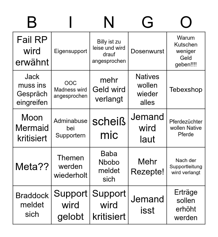 This bingo card has a free space and 24 words: Themen werden wiederholt, Support wird gelobt, mehr Geld wird verlangt, Braddock meldet sich, Warum Kutschen weniger Geld geben!!!!, Fail RP wird erwähnt, Jack muss ins Gespräch eingreifen, Eigensupport, Jemand wird laut, Baba Nbobo meldet sich, Natives wollen wieder alles, Moon Mermaid kritisiert, Mehr Rezepte!, Nach der Supportleitung wird verlangt, OOC Madness wird angesprochen, Jemand isst, Pferdezüchter wollen Native Pferde, Billy ist zu leise und wird drauf angesprochen, Tebexshop, Adminabuse bei Supportern, Erträge sollen erhöht werden, Meta??, Dosenwurst and Support wird kritisiert.