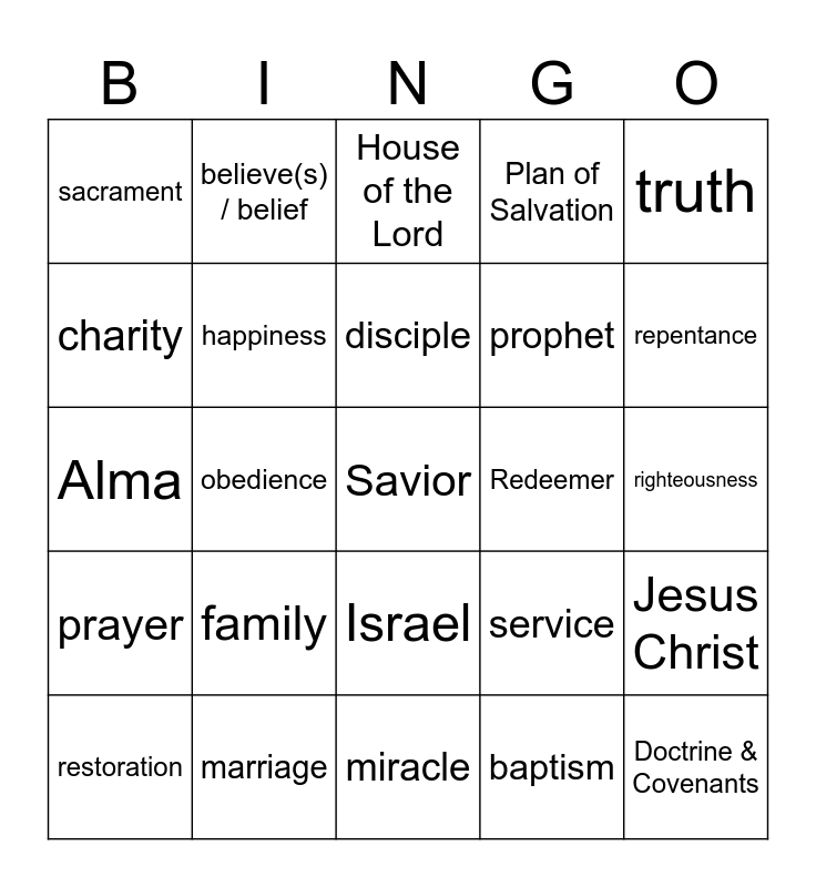 This bingo card has 47 words: forgiveness, Savior, Book of Mormon, miracle, family, mental health, believe(s) / belief, President Nelson, charity, agency, happiness, Plan of Salvation, Jesus Christ, service, doctrine of Christ, heart, disciple, Redeemer, revelation, truth, obedience, baptism, sacrament, prophet, testimony, repentance, restoration, Holy Ghost, Israel, prayer, eternal life, Joseph Smith, sacrifice, Come, Follow Me, Jehovah, marriage, righteousness, gratitude, Mosiah, Hosana, Doctrine & Covenants, House of the Lord, Alma, Isaiah, salvation, Nephi and Melchizedek Priesthood.