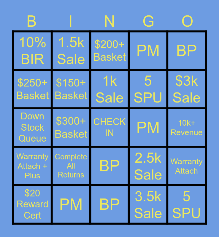 This bingo card has a free space and 24 words: Complete All Returns, PM, 1k Sale, $20 Reward Cert, BP, 10% BIR, $250+ Basket, 1.5k Sale, PM, BP, 5 SPU, Down Stock Queue, 2.5k Sale, Warranty Attach, $150+ Basket, 3.5k Sale, 10k+ Revenue, $200+ Basket, $3k Sale, $300+ Basket, 5 SPU, Warranty Attach + Plus, PM and BP.