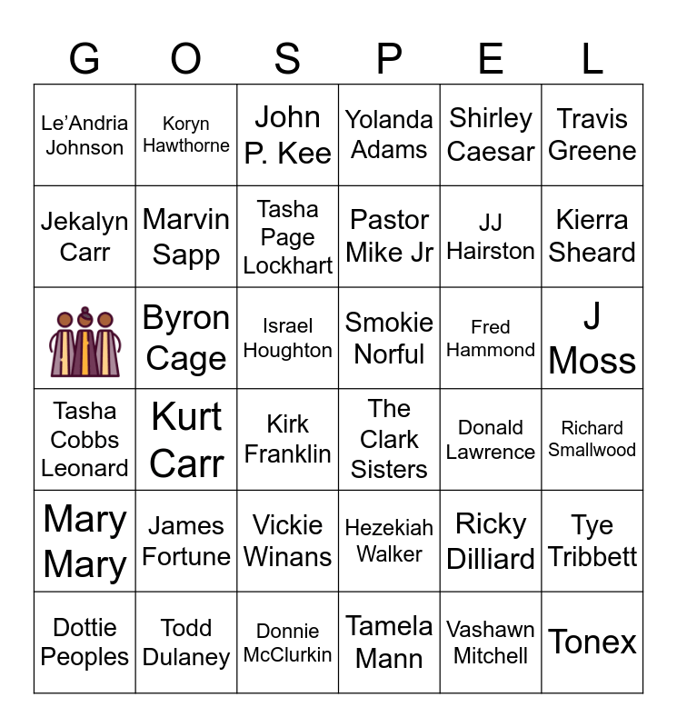 This bingo card has 1 images and 35 words: Hezekiah Walker, Vickie Winans, Tamela Mann, Jekalyn Carr, Tasha Cobbs Leonard, Smokie Norful, Marvin Sapp, Donnie McClurkin, Shirley Caesar, Ricky Dilliard, Kierra Sheard, Yolanda Adams, Tye Tribbett, Byron Cage, Pastor Mike Jr, Le’Andria Johnson, Mary Mary, Fred Hammond, John P. Kee, Israel Houghton, Kurt Carr, The Clark Sisters, Kirk Franklin, Donald Lawrence, Koryn Hawthorne, JJ Hairston, Todd Dulaney, Tasha Page Lockhart, Travis Greene, Tonex, Dottie Peoples, Richard Smallwood, J Moss, James Fortune and Vashawn Mitchell.