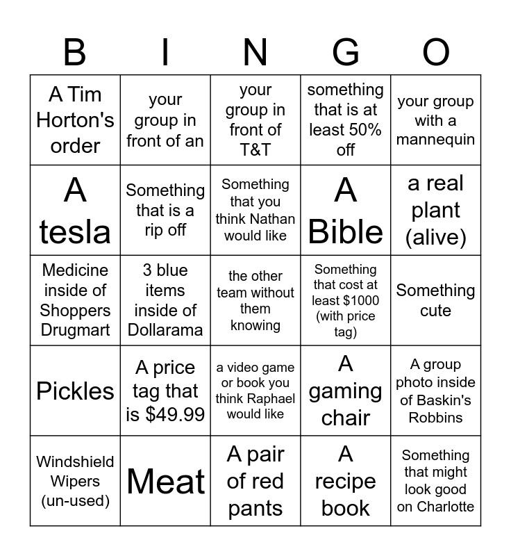 This bingo card has a free space and 24 words: A price tag that is $49.99, Meat, Something that you think Nathan would like, Windshield Wipers (un-used), your group with a mannequin, A Tim Horton's order, A tesla, your group in front of an, Something that cost at least $1000 (with price tag), a video game or book you think Raphael would like, A Bible, Medicine inside of Shoppers Drugmart, A gaming chair, A group photo inside of Baskin's Robbins, Something that is a rip off, A recipe book, Something cute, your group in front of T&T, a real plant (alive), 3 blue items inside of Dollarama, Something that might look good on Charlotte, Pickles, something that is at least 50% off and A pair of red pants.