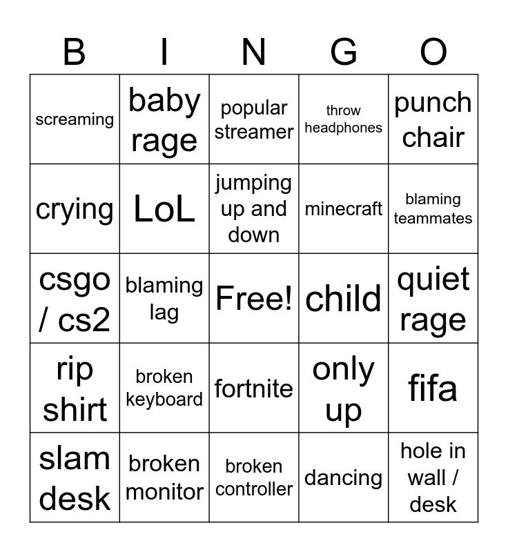 This bingo card has a free space and 24 words: broken keyboard, broken monitor, jumping up and down, slam desk, punch chair, screaming, crying, baby rage, child, fortnite, minecraft, csgo / cs2, only up, fifa, LoL, dancing, quiet rage, popular streamer, blaming teammates, blaming lag, hole in wall / desk, rip shirt, throw headphones and broken controller.