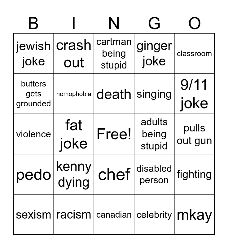 This bingo card has a free space and 24 words: kenny dying, racism, death, sexism, classroom, jewish joke, butters gets grounded, crash out, adults being stupid, chef, singing, violence, disabled person, fighting, homophobia, celebrity, pulls out gun, cartman being stupid, 9/11 joke, fat joke, mkay, pedo, ginger joke and canadian.