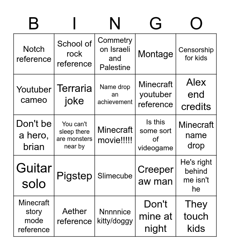 This bingo card has a free space and 24 words: Pigstep, Aether reference, Name drop an achievement, Minecraft story mode reference, Censorship for kids, Notch reference, Youtuber cameo, School of rock reference, Is this some sort of videogame, Slimecube, Minecraft youtuber reference, Don't be a hero, brian, Creeper aw man, He's right behind me isn't he, Terraria joke, Don't mine at night, Minecraft name drop, Commetry on Israeli and Palestine, Alex end credits, You can't sleep there are monsters near by, They touch kids, Guitar solo, Montage and Nnnnnice kitty/doggy.