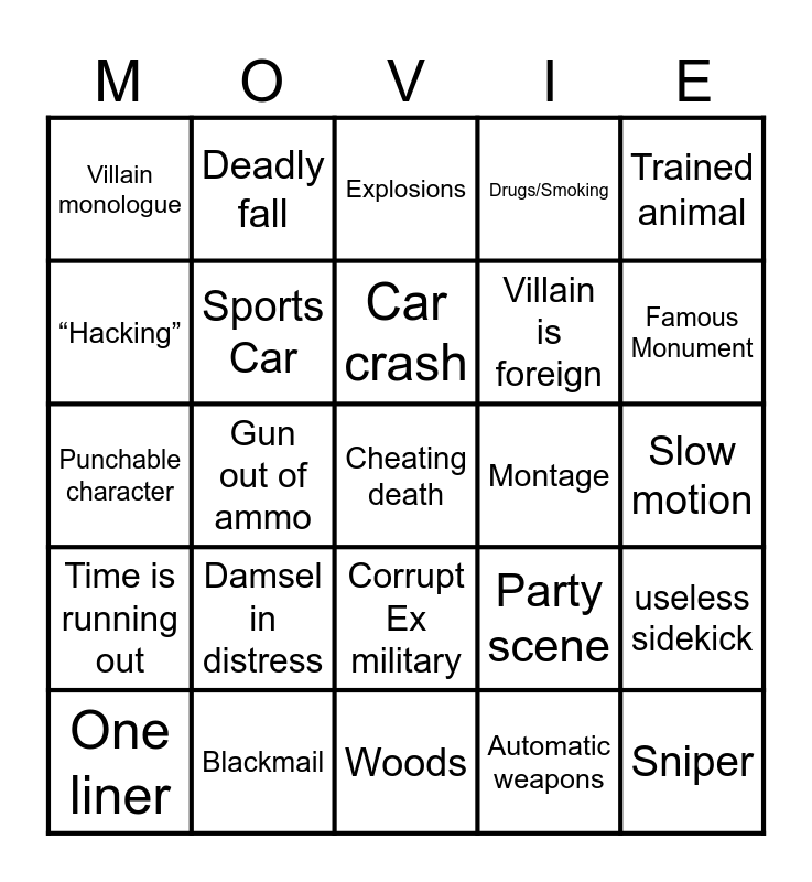 This bingo card has a free space and 24 words: One liner, Damsel in distress, Car crash, Automatic weapons, Trained animal, Villain monologue, Deadly fall, Explosions, Montage, Slow motion, Punchable character, Sports Car, Party scene, useless sidekick, “Hacking”, Blackmail, Woods, Drugs/Smoking, Famous Monument, Time is running out, Gun out of ammo, Corrupt Ex military, Villain is foreign and Sniper.