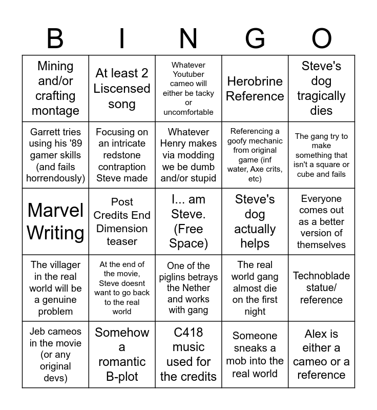 This bingo card has a free space and 24 words: At the end of the movie, Steve doesnt want to go back to the real world, Somehow a romantic B-plot, Whatever Henry makes via modding we be dumb and/or stupid, Jeb cameos in the movie (or any original devs), Steve's dog tragically dies, Mining and/or crafting montage, Garrett tries using his '89 gamer skills (and fails horrendously), At least 2 Liscensed song, Steve's dog actually helps, One of the piglins betrays the Nether and works with gang, Referencing a goofy mechanic from original game (inf water, Axe crits, etc), Marvel Writing, The real world gang almost die on the first night, Technoblade statue/ reference, Focusing on an intricate redstone contraption Steve made, Someone sneaks a mob into the real world, Everyone comes out as a better version of themselves, Whatever Youtuber cameo will either be tacky or uncomfortable, The gang try to make something that isn't a square or cube and fails, Post Credits End Dimension teaser, Alex is either a cameo or a reference, The villager in the real world will be a genuine problem, Herobrine Reference and C418 music used for the credits.