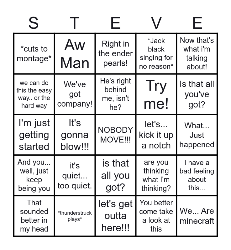 This bingo card has 25 words: it's quiet... too quiet., let's get outta here!!!, He's right behind me, isn't he?, That sounded better in my head, Now that's what i'm talking about!, *cuts to montage*, we can do this the easy way.. or the hard way, Aw Man, let's... kick it up a notch, is that all you got?, Try me!, I'm just getting started, are you thinking what I'm thinking?, I have a bad feeling about this..., We've got company!, We... Are minecraft, What... Just happened, Right in the ender pearls!, Is that all you've got?, It's gonna blow!!!, NOBODY MOVE!!!, *thunderstruck plays*, And you... well, just keep being you, *Jack black singing for no reason* and You better come take a look at this.